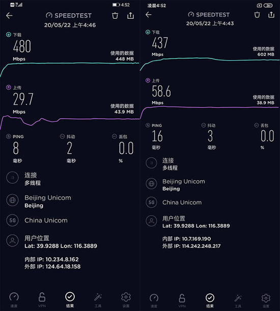 而在實(shí)際網(wǎng)速中,我個人使用的是中國聯(lián)通5G卡,套餐為199元的冰淇淋5G套餐。榮耀X10基本可以跑滿該套餐網(wǎng)速,下載速率穩(wěn)定在480Mbps左右,上傳速率為29.7Mbps,而且ping值和抖動值都很低,這意味著當(dāng)前網(wǎng)速相當(dāng)快而且穩(wěn)定。而小米10青春版的表現(xiàn)就要稍遜一些。
