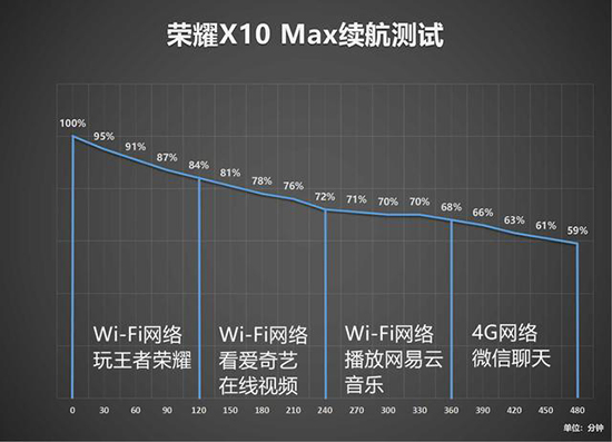 榮耀X10 Max在玩2小時(shí)王者榮耀、看2個(gè)小時(shí)電視、聽2個(gè)小時(shí)歌、社交聊天2個(gè)小時(shí)后。還剩下近六成的電量,基本上可以滿足兩天一充。