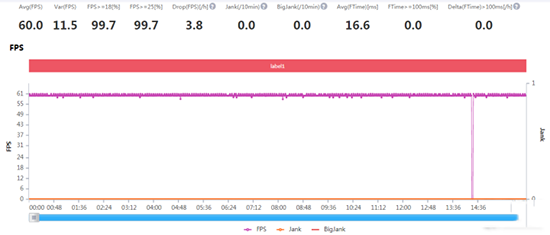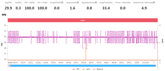 《王者榮耀》平均FPS60,也就是最高值。其中下圖FPS為0時(shí)是手機(jī)不小心熄屏造成,整體的波動(dòng)幅度非常之小,接近直線的FPS數(shù)值走勢(shì)圖也正面了榮耀30足夠強(qiáng)悍的性能表現(xiàn)。