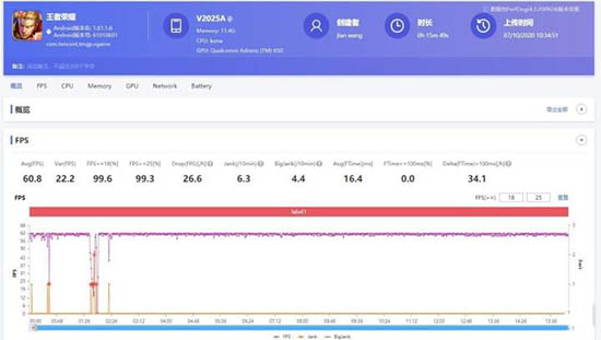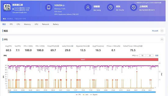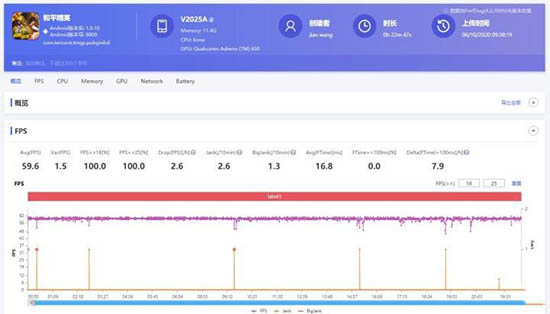 熱門游戲《和平精英》對(duì)GPU性能的要求更高,也是測(cè)試iQOO 5 Pro游戲表現(xiàn)重要的一項(xiàng)。在統(tǒng)一分辨率、畫質(zhì)、幀率模式下,游戲22分鐘,平均幀率59.6fps,平均每10分鐘卡頓次數(shù)為2.6,平均每10分鐘嚴(yán)重卡頓次數(shù)1.3次,詳細(xì)數(shù)據(jù)具體如下圖。