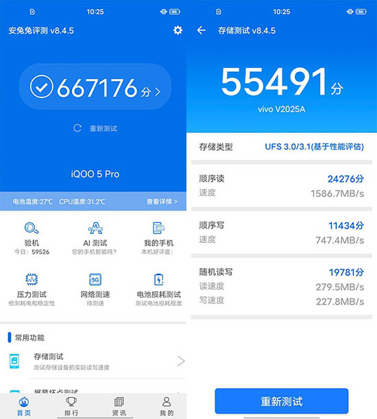 我們使用安兔兔進行綜合跑分和存儲測試。綜合跑分方面,iQOO 5 Pro得分667176分,展現(xiàn)出了旗艦硬件帶來的澎湃性能。存儲測試方面,iQOO 5 Pro測出的順序讀寫速度分別為1586.7MB/s和747.4MB/s,隨機讀寫速度分別為279.5MB/s和227.8MB/s。
