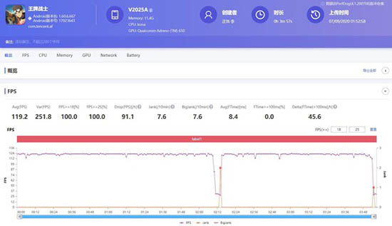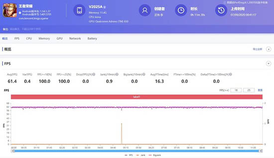 我們可以看到這款手機在三款游戲中都表現(xiàn)得十分穩(wěn)定流暢,其中《王牌戰(zhàn)士》還針對120Hz進行了專門的優(yōu)化,幀數(shù)可以達到120幀左右。這對于射擊游戲來說,無疑是十分友好的,而且《王者榮耀》幀數(shù)條平整,平均幀數(shù)也達到了61.4幀。