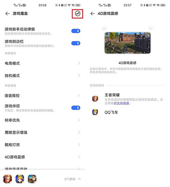 如果你想玩游戲玩的更爽,可以到游戲魔盒中對畫面、幀數(shù)、震動、聲效等進行自定義設置。比如當你在《王者榮耀》中斬獲四殺、五殺時就能在屏幕上看到專屬特效,亦或是可以在部分游戲中享受專屬4D游戲震感,iQOO甚至還針對《王者榮耀》中的英雄及其技能進行了震感定制,游戲沉浸感拉滿。不過有一點要吐槽一下,設置中的游戲空間標志做得有些抽象了,建議在設置做成一個單獨的選項。