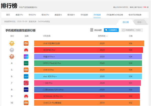 DxOMark手機(jī)視頻排行榜