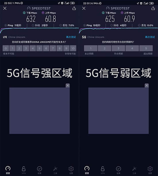 我們選擇了5G信號強和信號弱的地方分別進行5G網絡速度測試。小米10青春版在5G信號強的區(qū)域可以達到上行632Mbps、下行60.8Mbps的速度,抖動為2毫秒;在5G信號弱的區(qū)域可以達到上行625Mbps、下行60.9Mbps的速度,抖動為4毫秒。