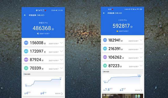 首先通過我們常用的安兔兔進(jìn)行常規(guī)的綜合跑分測試,跑分之前筆者均把兩款手機(jī)設(shè)置為性能模式,最后的結(jié)果榮耀30 Pro得分為486368,小米10 Pro得分為592817,可見在性能的表現(xiàn)上麒麟990 5G SOC相對于驍龍865還是有一定的差距的。