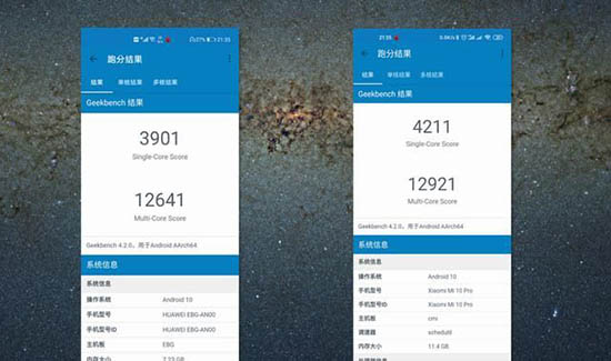 接下來筆者又通過Geekbench對兩款手機(jī)的CPU進(jìn)行了跑分測試,測試結(jié)果如下,榮耀30 Pro上的麒麟990 5G SOC的單核成績?yōu)?901分,多核成績?yōu)?2641分,而小米10 Pro上的驍龍865的單核成績?yōu)?211,多核成績?yōu)?2921,整體差距不大。