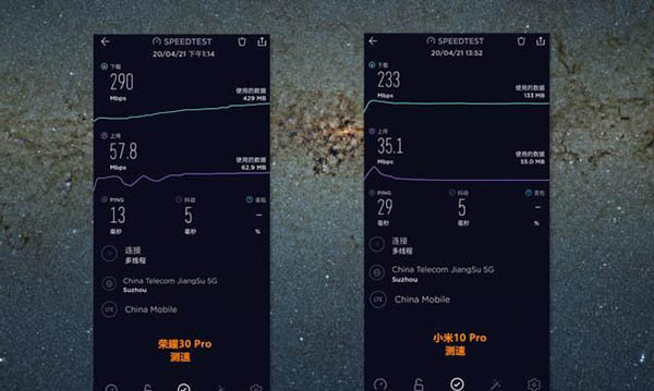 接下來我們來看一下實測,筆者通過在同一區(qū)域使用同樣的運營商對兩部手機進行5G網(wǎng)絡(luò)測速,測速軟件筆者選用也是我們最常見的SPEEDTEST,通過對榮耀30 Pro和小米10 Pro的5G網(wǎng)絡(luò)測速,得到了下圖當(dāng)中的成績,我們可以看到麒麟990 5G Soc集成的5G基帶,在網(wǎng)絡(luò)測速上要好于驍龍865的外掛5G基帶,從這點上也可以看出麒麟芯片集成5G網(wǎng)絡(luò)基帶上的優(yōu)勢,所以在5G網(wǎng)絡(luò)方面榮耀30 Pro得1分,且是對驍龍865碾壓的姿態(tài)勝出。