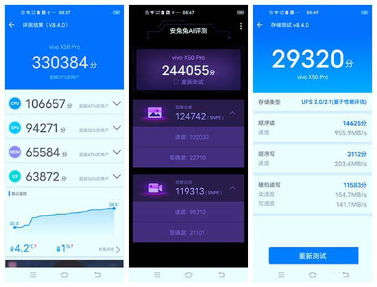 上圖:vivo X50 Pro安兔兔跑分成績(jī)