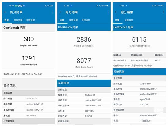 上圖:realme真我Q2 GeeKbench 5/4 單核/多核成績(jī)