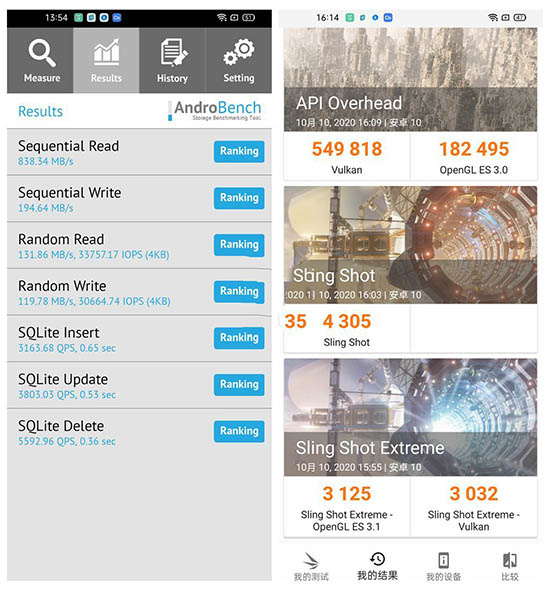 使用的是AndroBench中存儲(chǔ)測(cè)試,realme真我Q2順序讀取速度為838.34MB/s,順序?qū)懭胨俣葹?95.64MB/s,隨機(jī)讀取速度為131.86MB/s,隨機(jī)寫入速度為119.78MB/s,充分保障設(shè)備性能及運(yùn)行效率。