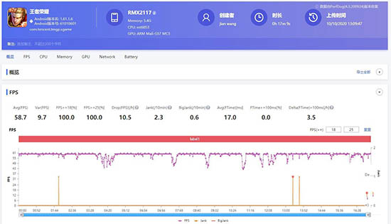 通過一款游戲,來測(cè)試realme真我Q2的性能表現(xiàn)。在王者榮耀環(huán)節(jié)首先將游戲幀率、畫質(zhì)開到高,打開角色描邊等選項(xiàng)。realme真我Q2都能夠在極高畫質(zhì)下游戲17分鐘,平均幀率58.7fps,平均每10分鐘卡頓次數(shù)為2.3,平均每10分鐘嚴(yán)重卡頓次數(shù)0.6,詳細(xì)數(shù)據(jù)具體如下圖。