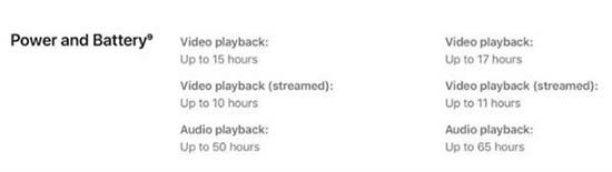 蘋果官網向來不列電池容量,習慣將電池續(xù)航分為三類指標:視頻播放、流媒體視頻播放、音頻播放。