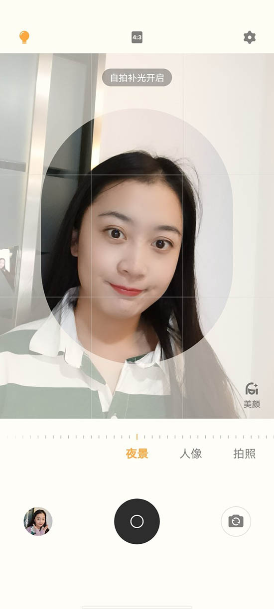 不同于常規(guī)手機的拍攝時閃白補光,vivo Y73s的屏幕柔光環(huán)支持補光時預(yù)覽,可以看到拍攝出的效果,還不會被拍攝剎那的閃白所“閃瞎”。而且值得好評的是屏幕柔光環(huán)的補光效果可以根據(jù)環(huán)境光線自適應(yīng)冷暖光,使得補光的色溫更加貼合環(huán)境光線,讓人臉膚色表現(xiàn)更加均勻。