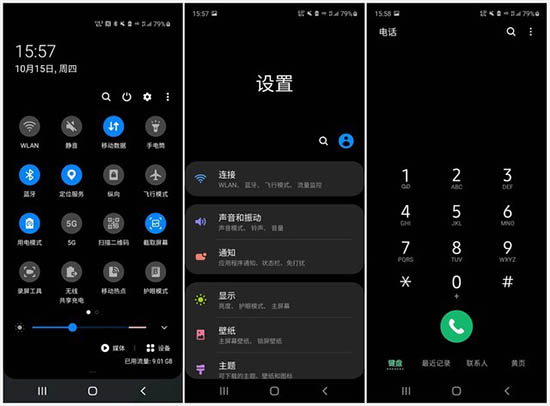 One UI 2.5的黑暗模式是一大特色,不僅可以做到光線顯示柔和舒適,利用OLED自發(fā)光的優(yōu)勢(shì)省電,還大量適配了第三方應(yīng)用。