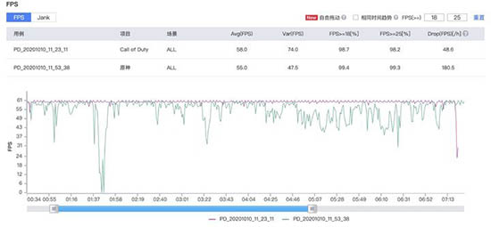 根據(jù)PerfDog的結(jié)果顯示,《使命召喚》在一加8T上表現(xiàn)很穩(wěn)定,在最高畫質(zhì)下,能夠長時間維持在58-60幀的狀態(tài),基本不會有卡頓和掉幀情況。