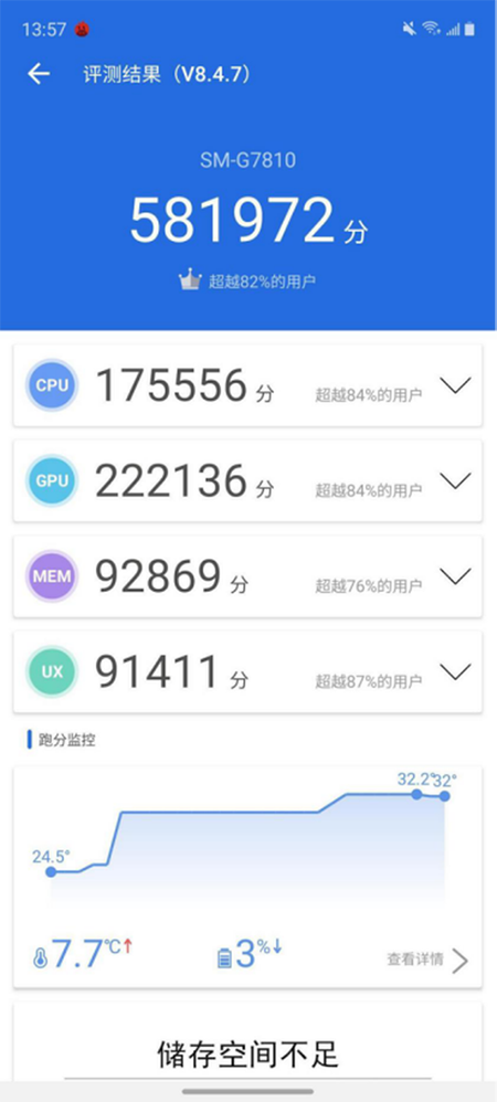 作為一款旗艦級的手機三星Galaxy S20 FE 5G的性能是無需擔心的,至于表現(xiàn)如何,我們先來跑個分。安兔兔581972,可見雖然與Galaxy S20 5G同為驍龍865處理器,關(guān)于這個“老朋友”詳細信息就不再贅述,但半年過去,三星讓驍龍865釋放出了更強性能,跑分有著三萬分左右的提升。