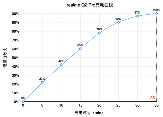 實(shí)測(cè)使用包裝內(nèi)的充電頭為realme真我Q2 Pro充電,15分鐘便可充電60%,0-100%充電共耗時(shí)35分鐘。使用生活中的碎片化時(shí)間,便可以快速為手機(jī)補(bǔ)充電量。