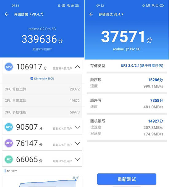 跑分方面,realme 真我Q2 Pro安兔兔跑分成績接近34萬分,其中CPU部分成績較為突出。存儲性能測試方面,順序讀/寫速度分別為999.1MB/s與481.0MB/s