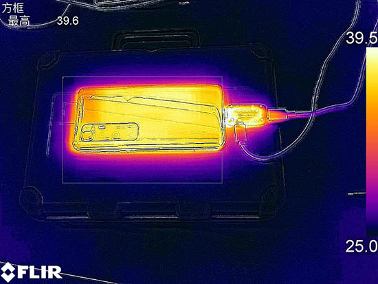 將手機(jī)翻轉(zhuǎn),背面最高溫度為40.4℃,溫升11.6℃。此時(shí)高壓大電流充電剛結(jié)束,手機(jī)整體的溫度最高上升了13℃。