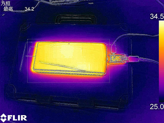 最后,37分左右充電結(jié)束的時(shí)間點(diǎn),手機(jī)正面最高溫度34.2℃,溫升5.4℃。