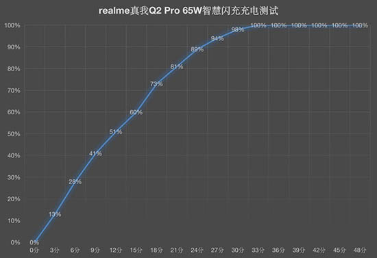 我們將realme真我Q2 Pro的電量放光,進(jìn)行充電測試,3分鐘充到13%,9分鐘充到41%,15分鐘充至60%,33分鐘充滿,符合65W智慧閃充的理論充電水準(zhǔn)。這樣的充電速度,還是非常令人滿意的。