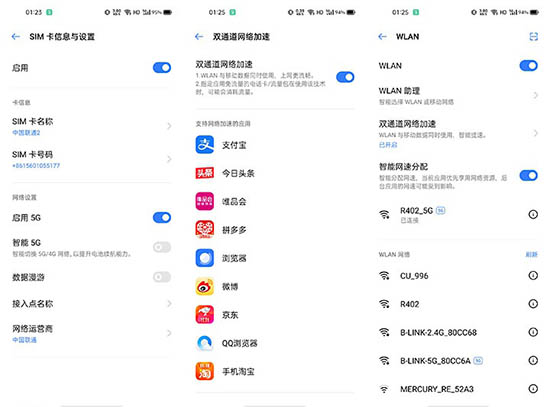 針對不同的網(wǎng)絡(luò)連接狀況與網(wǎng)絡(luò)質(zhì)量,realme真我Q2 Pro還可利用Smart 5G技術(shù)在4G網(wǎng)絡(luò)和5G網(wǎng)絡(luò)之間自動切換,智能調(diào)整組網(wǎng)策略,合理調(diào)整功耗與帶寬,進而有效降低功耗。雙通道網(wǎng)絡(luò)加速功能也允許Wi-Fi和5G同時在線,進而保證網(wǎng)絡(luò)連接穩(wěn)定性。該功能支持支付寶、拼多多、微博、京東等常用APP。用戶還可在“設(shè)置—WLAN”中開啟智能網(wǎng)速分配,以獲得最佳的網(wǎng)絡(luò)連接表現(xiàn)。
