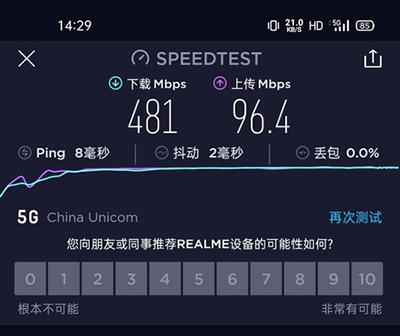 5G方面,我們用Speedtest給真我Q2測了一次速,通過實際測試發(fā)現(xiàn):在中國聯(lián)通限速500Mbps套餐下,真我Q2的下行速率可以達(dá)到481Mbps,上行速率可以達(dá)到96.4Mbps,Ping值為8毫秒,抖動2毫秒,整體表現(xiàn)非常出色。如果你在5G網(wǎng)絡(luò)下下載一款游戲,下載速度會驚艷到你。我們以1.88GB的《和平精英》為例,峰值速度可以達(dá)到50MB/s,短短十幾秒的時間就可以下載50%,全部下載完不足一分鐘,速度之快可見一斑。