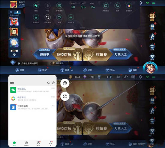 操作方面則是在游戲過(guò)程中僅需要從頂部?jī)山窍蛳禄瑒?dòng)即可調(diào)出游戲空間,并可以在其中選擇是否錄屏、拒接來(lái)電、屏蔽通知,另外還支持游戲時(shí)開(kāi)啟微信功能,邊聊天邊游戲也是一個(gè)不錯(cuò)的選擇。