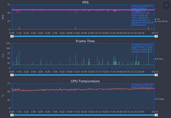 游戲全程幀率記錄如上,單局25分鐘游戲內(nèi),三星Galaxy S20 FE 5G平均幀率為58.9fps,大于55fps的幀率占比超過(guò)99.3%,基本能保證全程穩(wěn)定維持在60fps示意線(xiàn)附近。