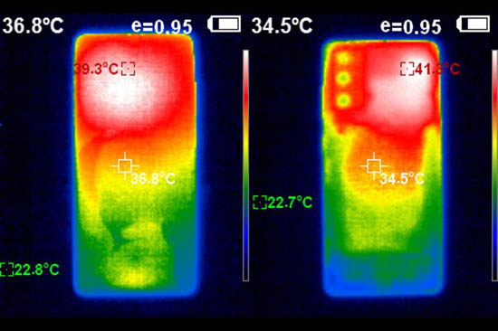 開(kāi)啟高性能模式情況下,30分鐘游戲后手機(jī)正面最高溫39.3℃,背面最高溫41.3℃,熱區(qū)則主要集中在手機(jī)上半部分。