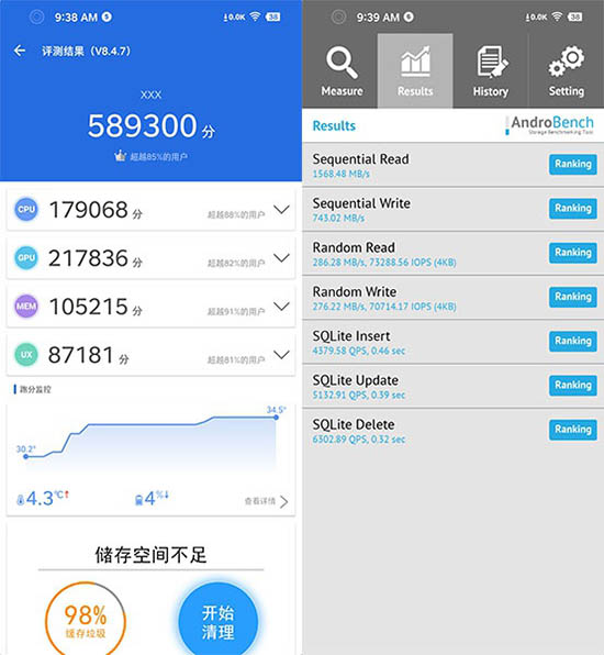 堅果R2的頂級規(guī)格讓我們不需要為性能有任何擔(dān)心,來看一下跑分測試成績。這里我們?nèi)恳韵到y(tǒng)默認(rèn)的情況進(jìn)行測試。安兔兔評測跑分59萬分左右,存儲的測速度上寫入速度尤為值得關(guān)注,接近750MB/s的速度表現(xiàn)驚人,在實際的應(yīng)用安裝上亦是瞬間完成。當(dāng)然,跑分成績僅僅是一個參考,實際體驗則更為重要。