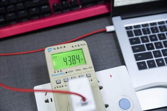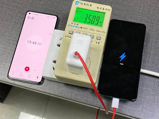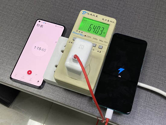 剛從0%電量插上充電器,功耗儀顯示功率達(dá)到了64W以上,65W閃充開啟,12分鐘就充到50%電量,此時(shí)充電頭功率降到了45W。在19分44秒,電量達(dá)到了70%,與官方數(shù)據(jù)一致。