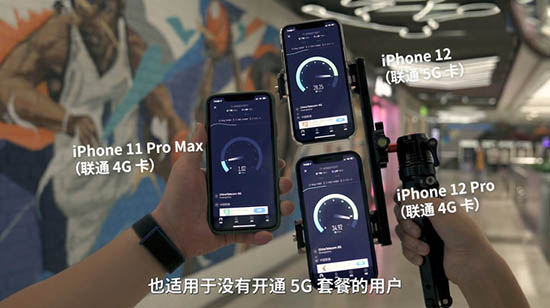 我們手上就有一張沒開5G的聯(lián)通4G卡,插到iPhone 12后,信號(hào)欄上也顯示了5G的標(biāo)志,速率上也會(huì)比4G卡插4G手機(jī)要快。