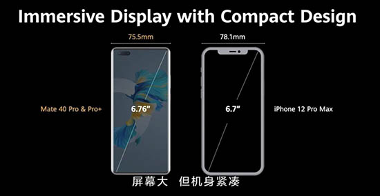 在介紹屏幕和設(shè)計時,余承東將Mate40 Pro&Pro+和iPhone 12 Pro Max對比,分別采用6.67英寸柔性O(shè)LED屏和6.7英寸OLED全面屏,他得出結(jié)論——自家產(chǎn)品有更大的屏幕、較窄的機(jī)身,對習(xí)慣單手操作者相對更加友好。