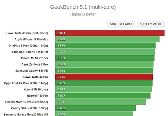 從架構更新來看,麒麟9000芯片的性能表現(xiàn)還是非常喜人的。外媒也第一時間測試了它的實際性能對比,以所搭載的華為Mate40 Pro為代表機型,在GeekBench的多核CPU測試中,性能跑分3704。