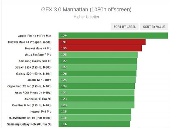 對于硬件提升明顯的GPU方面,在3D Mark的測試中,Mate40 Pro都完全壓制住了高通驍龍865+,有超過20%的性能優(yōu)勢。但在GFXBench的離屏測試中,Mate40 Pro在安卓陣營表現(xiàn)最強,然而依然不敵iPhone11 Pro Max。