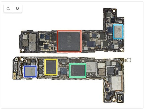 Ifixit網(wǎng)站表示,蘋果iPhone 12/Pro主板幾乎一模一樣。圖中紅色部分為A14處理器,其下是美光的內(nèi)存,iPhone 12搭載了4GB LPDDR4內(nèi)存,iPhone 12 Pro則是搭載6GB LPDDR4內(nèi)存。綠色的部分是高通的驍龍X55調(diào)制解調(diào)器。