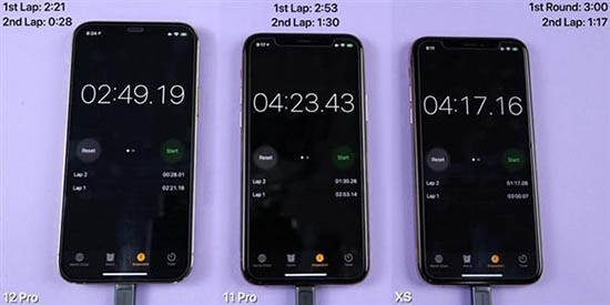 開機(jī)速度方面,iPhone 12 Pro最快,XS其次,11 Pro最慢。