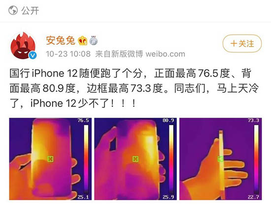 在全新的蘋果iPhone 12/12 Pro上市之后,安兔兔官方微博發(fā)布的一則推送引起了網(wǎng)友的熱議——稱iPhone 12最高局部溫度達(dá)到了80度,盡管隨后發(fā)布了致歉聲明,但是依舊讓iPhone 12系列的散熱能力正式“出圈”,成為全民關(guān)心的熱點(diǎn)。