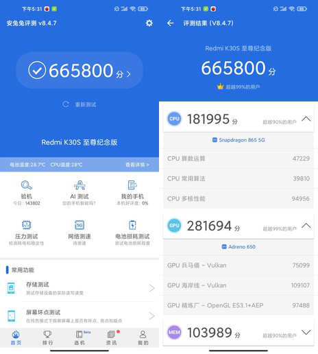 經(jīng)過測試,Redmi K30S至尊紀(jì)念版安兔兔總分為665800,其中CPU得分為181995、GPU得分為281694。