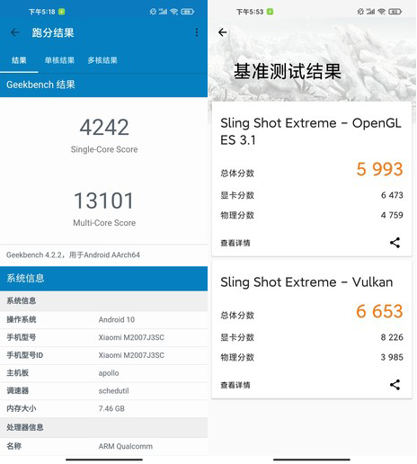 Geekbench單核得分為4242、多核成績?yōu)?3101。強悍的單核成績,意味著系統(tǒng)級別的日常操作、滑動都會十分流暢;而強悍的多核實力,則能夠助你在特效拉滿的游戲中達成“行云流水”的神操作。如果你是一個游戲黨,那么對畫面的要求一定很高。驍龍865的圖形處理實力在3Dmark的測試中體現(xiàn)得淋漓盡致。5993的高分,流暢運行各種大型游戲都不在話下。