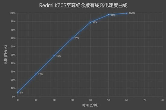 經(jīng)過實(shí)際測試,Redmi K30S至尊紀(jì)念版耗時(shí)60分鐘從5%充入100%,其中10分鐘充入22%電量,30分鐘充入65%電量。