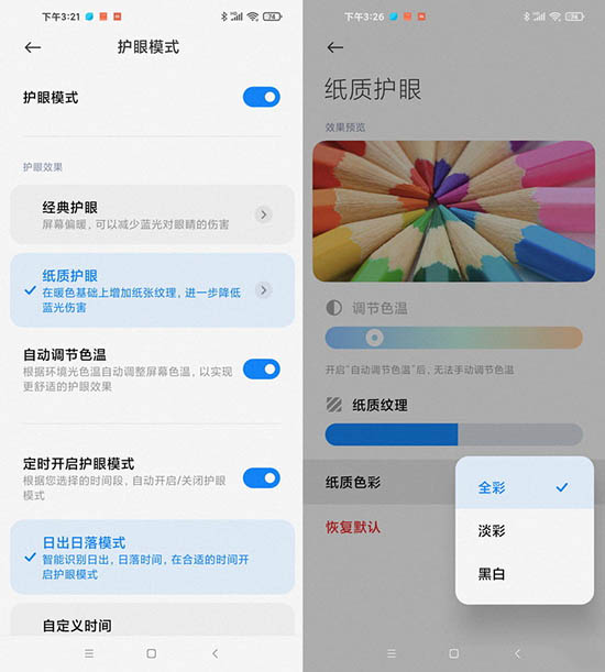 如果你覺得這都不夠,那么Redmi的工程師甚至還有主意。在Redmi K30S至尊紀(jì)念版的顯示設(shè)置中,我們找到了全新的增強(qiáng)護(hù)眼模式,這次它不僅可以實現(xiàn)自動開關(guān)護(hù)眼、自動根據(jù)光線調(diào)節(jié)屏幕色溫,還新增了“紙質(zhì)護(hù)眼”功能。在這個模式下,Redmi K30S至尊紀(jì)念版不但能提供淡彩、黑白等多種低對比度護(hù)眼模式,還能在屏幕上模擬出紙質(zhì)紋理,再配合夜光屏功能,讓手機(jī)屏幕的閱讀觀感更接近紙質(zhì),對眼睛的刺激更小。