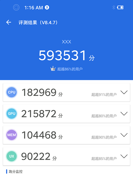 堅(jiān)果R2搭載了高通驍龍865旗艦處理器,7nm制程工藝,最高主頻可達(dá)2.84Ghz,Adreno?650?GPU,為用戶的日常使用和游戲體驗(yàn)提供了強(qiáng)有力的支持。我這里通過(guò)跑分軟件進(jìn)行了測(cè)試,安兔兔分?jǐn)?shù)為593531。