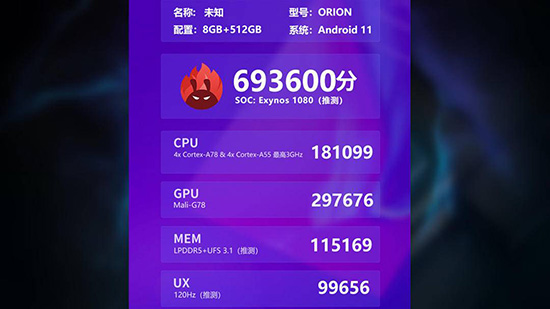 在安兔兔官微公布的跑分結果中,三星Exynos 1080的CPU跑分成績?yōu)?81099、GPU跑分成績?yōu)?97676。與驍龍865 Plus相比,三星Exynos 1080性能總分和GPU數(shù)據(jù)均有明顯優(yōu)勢,瞬間拉開了一定檔次。