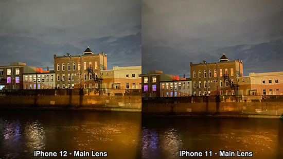 在這組依然是夜間拍照的對比中,iPhone 12和iPhone 11之間的區(qū)別也主要集中在曝光度方面,可以看到的是,iPhone12拍攝的照片中,右側(cè)區(qū)域的建筑物表面和左側(cè)部分區(qū)域的亮度要高,而iPhone 11相比這些對應(yīng)的區(qū)域亮度則比較低一些。整體來看,iPhone 12在這張夜景拍照的區(qū)別中,整體效果要比iPhone 11更好。