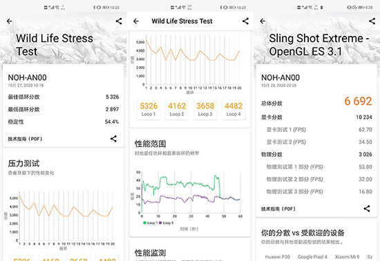 圖形性能上,麒麟9000芯片的升級幅度巨大,24核心的Mali-G78 GPU,相比上一代的麒麟990 5G有著60%的性能提升。高性能更能匹配90Hz高刷新率屏幕,針對游戲場景進(jìn)行專門優(yōu)化,使之在游戲中獲得更出色的流暢性表現(xiàn)。而從3DMark的測試成績來看,顯卡得分已經(jīng)超越了10000分,比起驍龍865機(jī)型的8000分,領(lǐng)先幅度高達(dá)20%,顯然麒麟9000芯片的GPU升級效果顯著。另外在3DMark的新場景測試中,華為Mate40 Pro也表現(xiàn)出不錯的穩(wěn)定性。