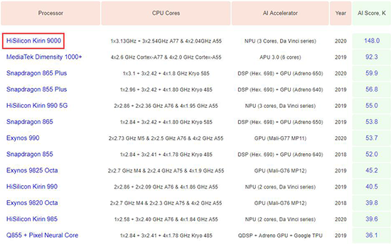 麒麟9000芯片在AI性能上繼續(xù)保持領(lǐng)先,采用新一代的NPU,擁有雙大核+微核的架構(gòu)設(shè)計(jì),能對不同的應(yīng)用環(huán)境去使用最合適的NPU核心,做到性能與功耗之間的平衡。新一代的NPU性能提升顯著,在AI Benchmark公布的最新性能測試上,麒麟9000芯片處于全面領(lǐng)先,綜合分?jǐn)?shù)高達(dá)148分,比起其它產(chǎn)品領(lǐng)先幅度在60%以上。