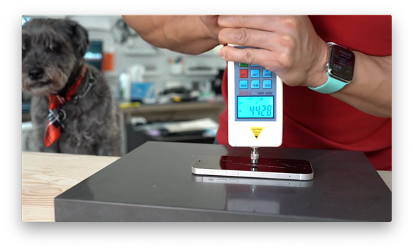 另一個(gè)YouTuber MobileReviewsEh則采用了不同的測(cè)試方式,他使用一臺(tái)推拉力計(jì)測(cè)試了iPhone 11和iPhone 12的屏幕硬度,兩者的數(shù)值分別為352N和443N,也就是說(shuō)在出現(xiàn)物理裂痕之前,iPhone 12的屏幕能夠經(jīng)受更大的外力。